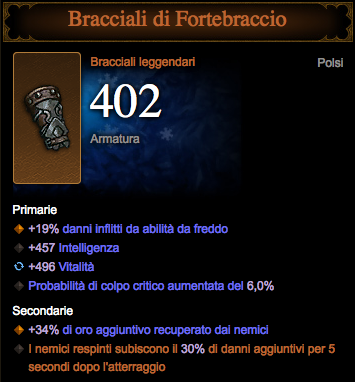 - Bracciali: vengono usati generalmente i Bracciali di Fortebraccio perché potrebbero attivare (tramite l'abilità piranhado) un bel bonus ai danni con la loro stat secondaria specifica. In alternativa, si può optare per delle Catene dello Schiavo, che rollano 5 primarie e quindi si può avere un maggior numero di statistiche difensive. Per quanto riguarda i Fortebraccio, il roll ideale è quello classico dei bracciali: %danni elemento 18-20% (in questo caso danni da freddo), intelligenza, vitalità e prob di critico (5-6%). Se il bonus secondario poi è prossimo al 30%, ancora meglio.